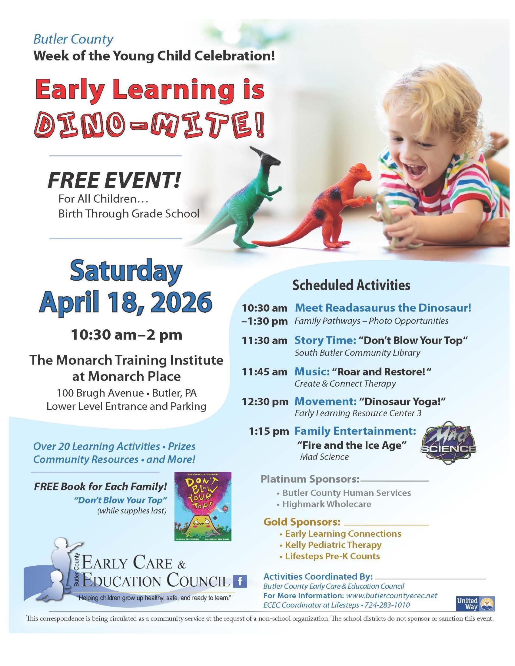 The Monarch Training Institute at Monarch Place, 100 Brugh Ave. Butler, PA, is hosting a Week of the Young Child event for children from birth to grade school. Saturday, April 18, 2026, from 10:30 - 2 pm. Over 20 activities and prizes will be at the event. Each family will receive a book while supplies last.
